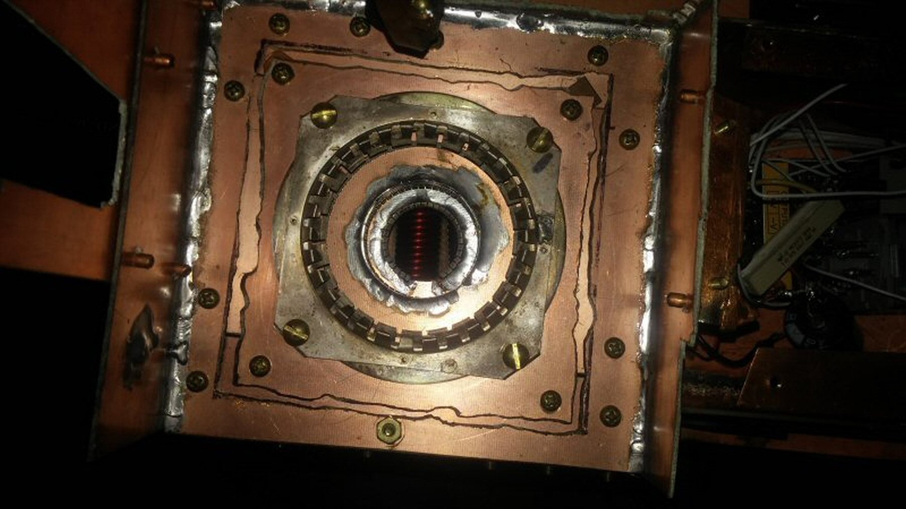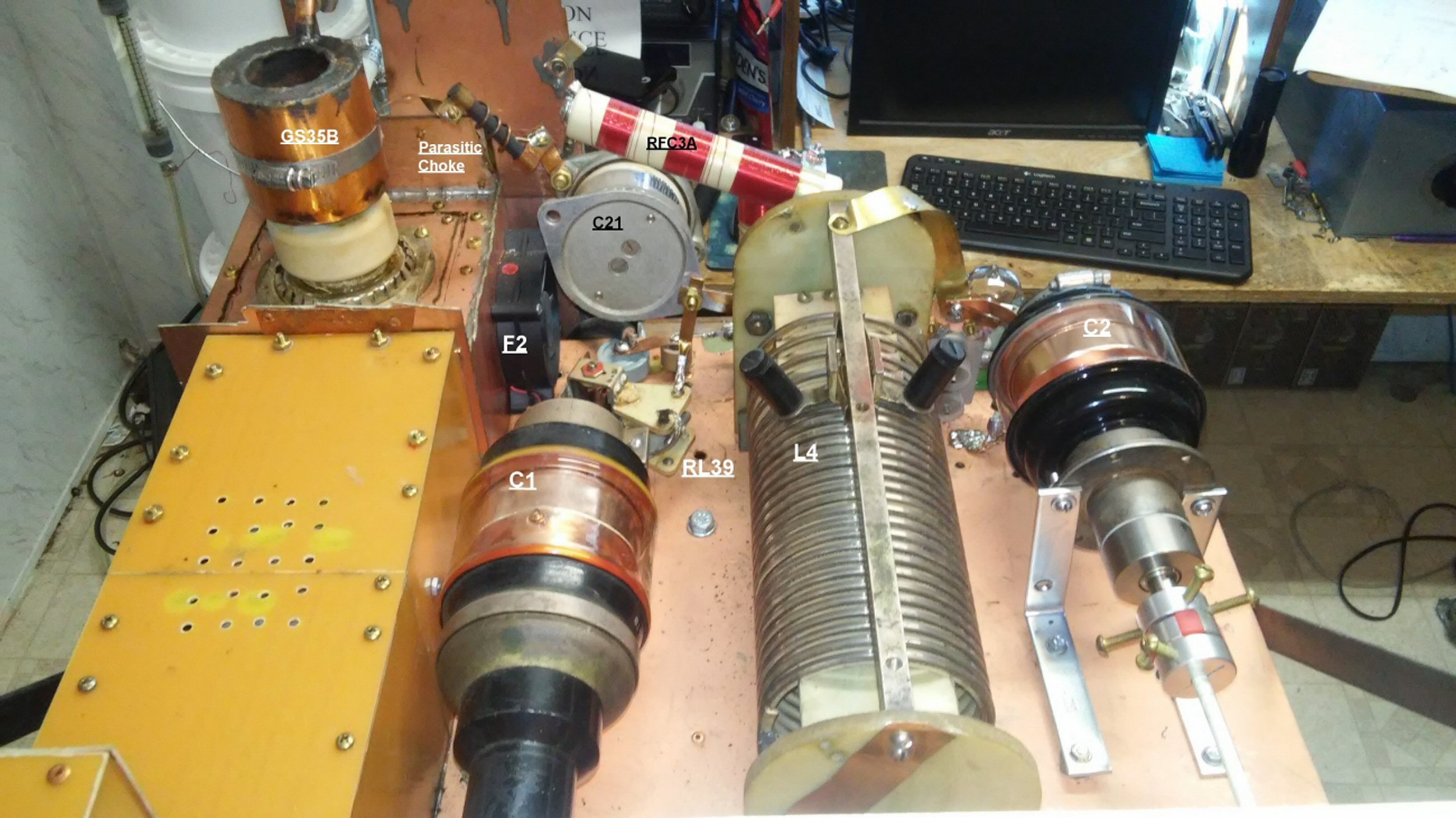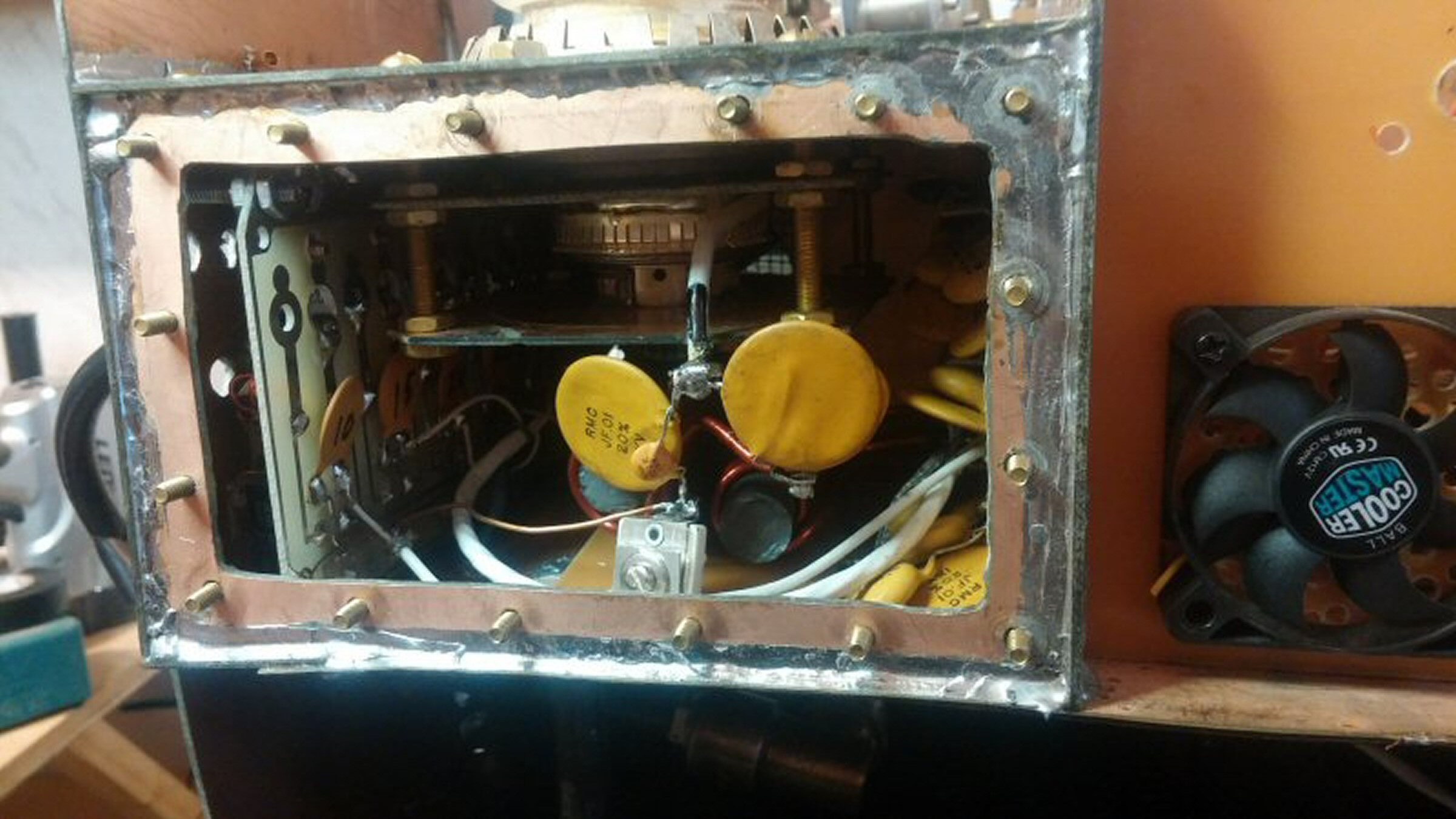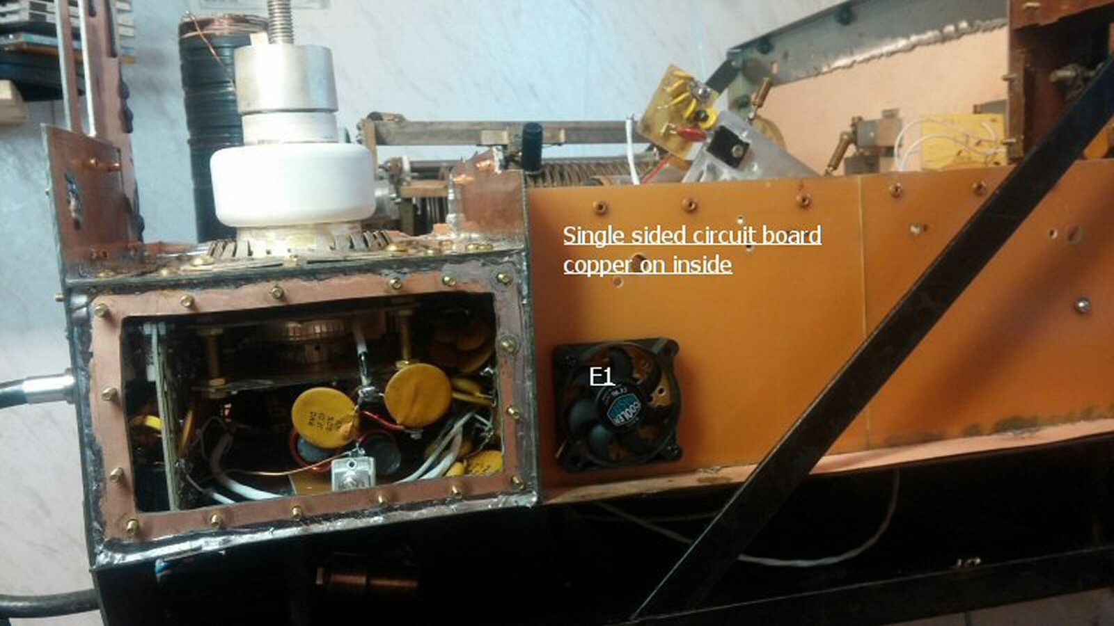 I saw an article by PA3CEG showing converting the cooling structure of a GS35B for liquid cooling. This is very good as the cooling structure is bolted to the tube allowing you to convert it and then using it on any tube. I found a source where I was able to purchase three new tubes and one cooling structure. I removed the fins from the anode cooling structure and built the liquid cooling structure, using a piece of copper pipe for the outer cylinder and the original cylinder, had two doughnut shaped pieces of brass cut for me at a machine shop, then did the rest my self. when finished I plugged one tubing connection and applied about 30 psi of air to the other tubing connection, then putting the cooling structure into a bucket of water and finding any air leaks, then sealing the leaks one at a time until it was totally air tight. I decided this was a better option then finding another 4CX1500B for my old RF deck so decided to use it for the new GS35B liquid(Transformer oil) cooled amplifier. I then redid my chassis construction of the cabinet. I found I could get double and single sided circuit board on eBay at a good price so got enough to laminate on top of the front and top of the existing cabinet structure and then build the 3 chassis for the tube, control, and junction box with copper walls and tops and bottoms, all the seals soldered together except the access covers which used either brass screws or brass screws