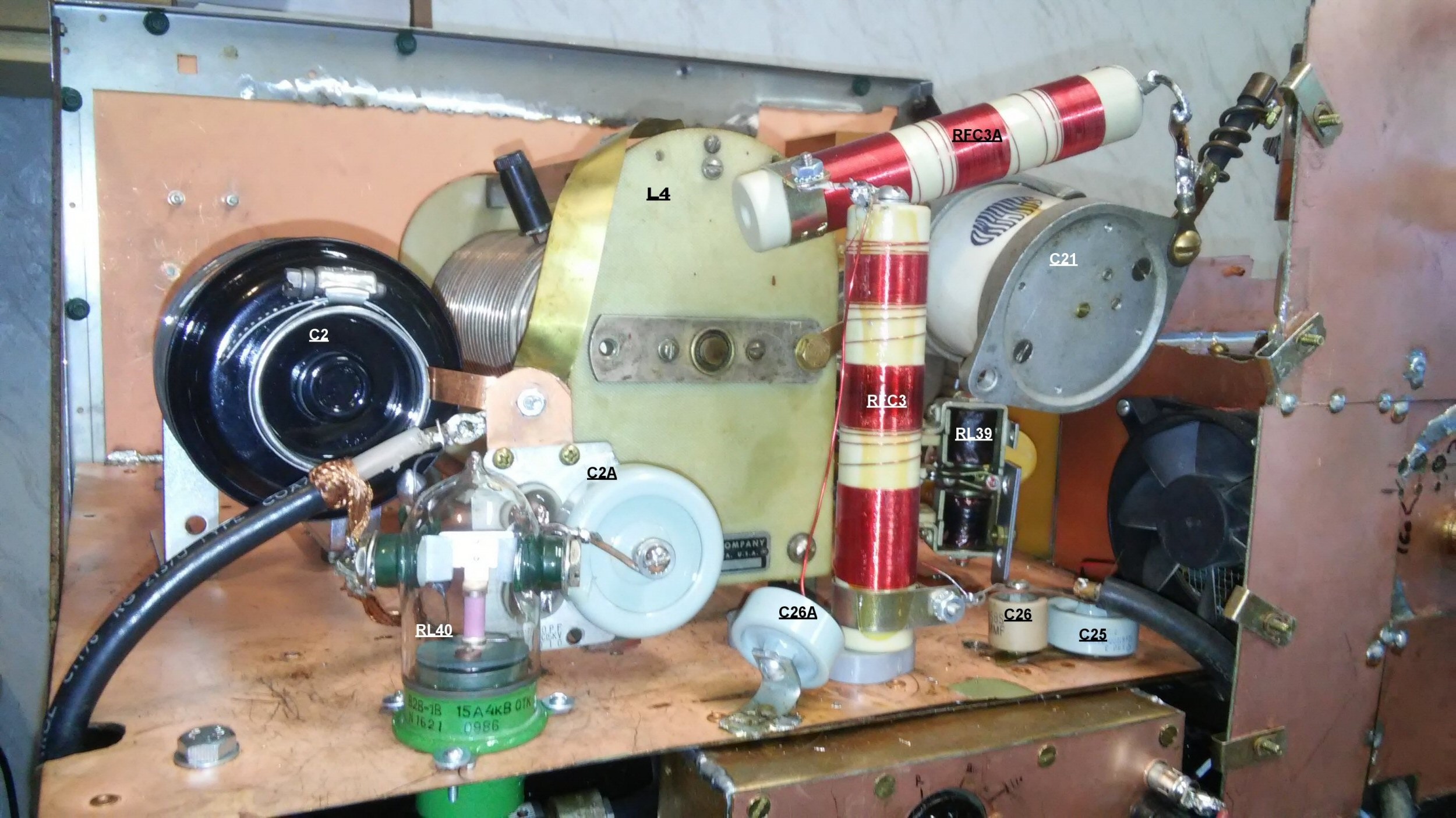 Later after I got tired of changing link coils in the 4-1000 all the time I was able to do a trade for a 4CX1500B and socket. This I wanted to put in a different cabinet so as to not disable the 4-1000, so again I went to the power company and was able to get the transformer I am presently using. I started looking for a cabinet and a ham friend had the power supply cabinet I am presently using, I was told it had been the power supply cabinet for the city of Medford Oregon's police AM transmitter. It is nice has doors on each side that open and nice wide roller wheels. So now I needed a cabinet for the RF deck. I was at a friends house one day, he was a fixit guy, worked on most anything, later he also became a ham. I saw this nice Litton restaurant microwave oven, mostly all stainless steel, sitting on a shelf in his shop, asked about it, he said it was not repairable and they didn't want it back, so I asked what he wanted for it, he gave to me free. I removed the door and took it over to a friends shop where he had a cutting torch as at the time I did not have one, I cut out the oven compartment leaving just the bottom and front ring(after removing the door and cutting out the oven comparmnet all you see from the front is a hole where the oven cooking compartment was like a square ring). The cover was one piece the top and sides are stainless steel one piece with screws only at the bottom of the back and finger stock for connecting to the bottom and front of the cabinet. At this point I had a pretty poor looking cabinet, I had removed the oven door and cut out the oven leaving just about an inch of metal around where the oven compartment had been. If you look at the second photo in the series on this page you can see the back of the cabinet front at the top of the photo, you can see the raged cut edges of the original stainless cabinet. I made an aluminum front plate, and a steel shelf inside that stood up on spacers about 2 inches, inside the cabinet. I used the cabinet this way o build my 4CX1500B RF deck. Construction was similar to my existing, except no copper, all was steel. The 1500B worked well but it was a pull-out tube and in time finally died from a cathode to grid short.