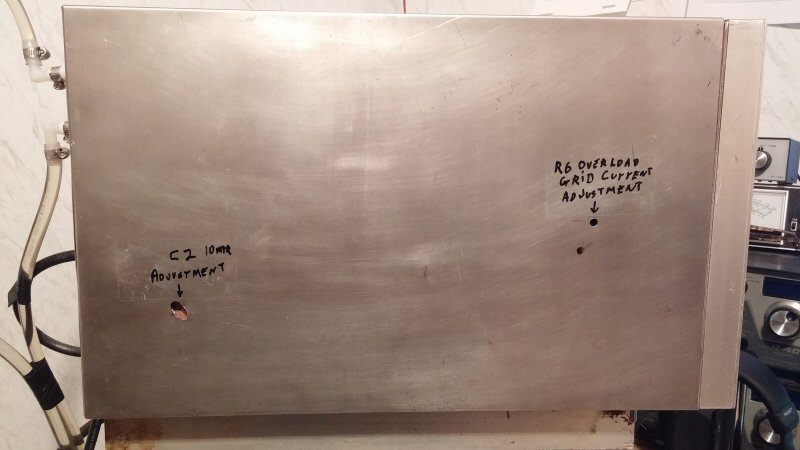 very low C so does not give any problems for the other bands. C13 is a parallel network made up of a .01µf and a .001µf disk ceramic capacitor. In the photo's below you can see how to adjust the tuned imput with the amplifier totally operational, also it shows how to adjust R6 to set the overload grid current limit.